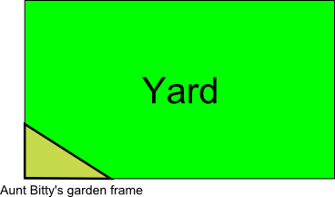 - I wonder if there’s “too much” up front information. Could Aunt Bitty roll out different aspects of the project in stages? For example, provide that first diagram, and perhaps and area of garden space and have students come up with the dimensions at first. Then examine student results, followed by the incorrect diagram of the obtuse triangle. At that point, there may be a “need to know” regarding the possibility of a right triangle with particular dimensions. Here’s an example of what I mean.