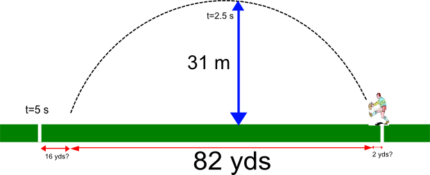So in the vertical it takes 5 second to go from the punter’s foot (which we’ll assume is a lot like the ground) to the ground at the ~16 yard line.