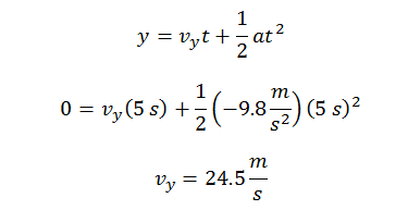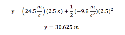 So the ball’s initial velocity in the vertical direction was about 24.5 m/s. If we move things around a bit, we can find the top of the ball’s trajectory (i.e. the height it reached). At the height of the ball’s trajectory t=2.5, so we have the following: