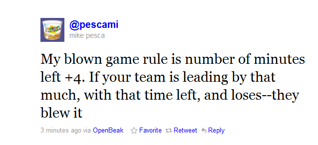 A few minutes ago the other day, NPR’s Mike Pesca tweeted his mathematical rule as to what constitutes a “blown game” in basketball.