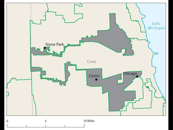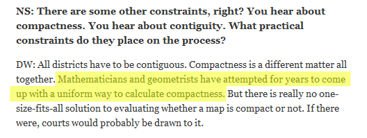- Other potential metrics for students to measure: The distance between a population center and the borders of the distrct. Is there a way we could assign a penalty for districts who have conspicuous gaps or, as in the case in Illinois above, a tiny stretch of road (or something) connecting two large areas?