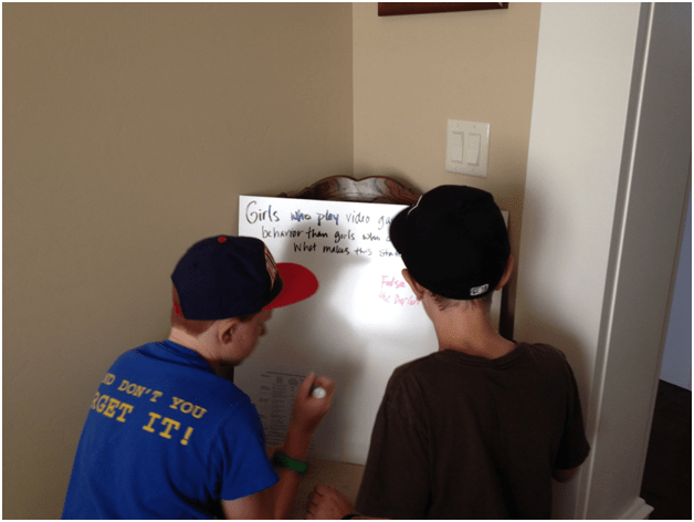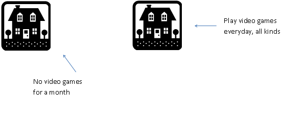 I asked them to then draw a picture of an experiment they could run to prove that video games really did decrease violence. Each team struggled for a bit but then one team had drawn a picture of two houses: