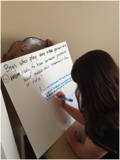 As I was walking around, I found that the questions they had the hardest time with were the tables about violent behaviors for the gamers. I had semi-anticipated this based on the fact that it was not only complicated but the question asked them about data that was NOT on the chart—the overall incidence rate of behaviors is listed, but it does not disaggregate non-gamers. It was really interesting to hear the dialogue and it was also a great opportunity to demonstrate the value of a good graphical summary of data.