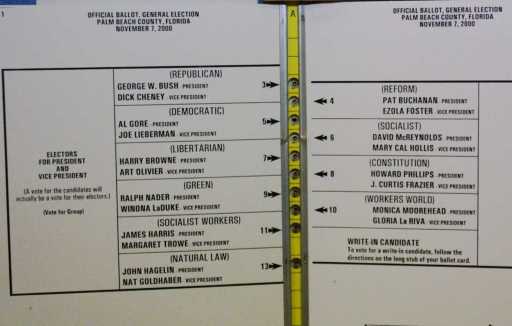 Meanwhile, angry Democratic voters in Palm Beach County complained that a confusing “butterfly” ballot in their county caused them to accidentally vote for the Reform Party candidate Pat Buchanan instead of Gore. See the ballot below.