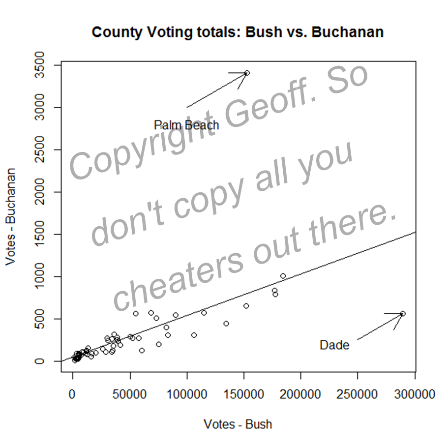 - Make a scatterplot and a linear fit and be, like, DUH, something was whack in Palm Beach county. (data of Bush votes and Buchanan votes by countyare at the bottom of this post)