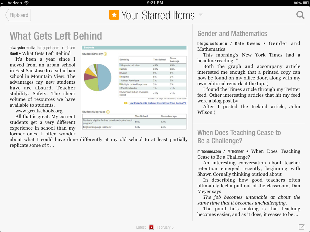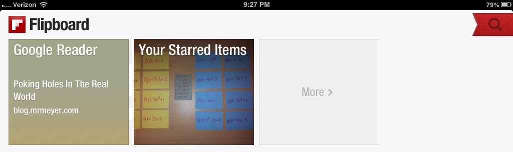 3) Sync Google Reader to your Flipboard, and voila! You can quickly catch up on the days’ reads you missed. You can flip through quickly, looking for topics of interest or cool cover photos.