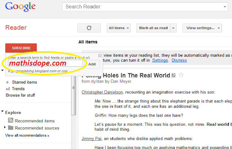 2) Toss every math blog you like to read into the Google Reader Subscriber. DON’T start tossing in other lesser blogs or NY Times ‘The Caucus’ or anything like that. Nothing that generates that much content, please. Use something else for that. We’re devoting our entire Google Reader to Math Blogs, thankyouverymuch.
