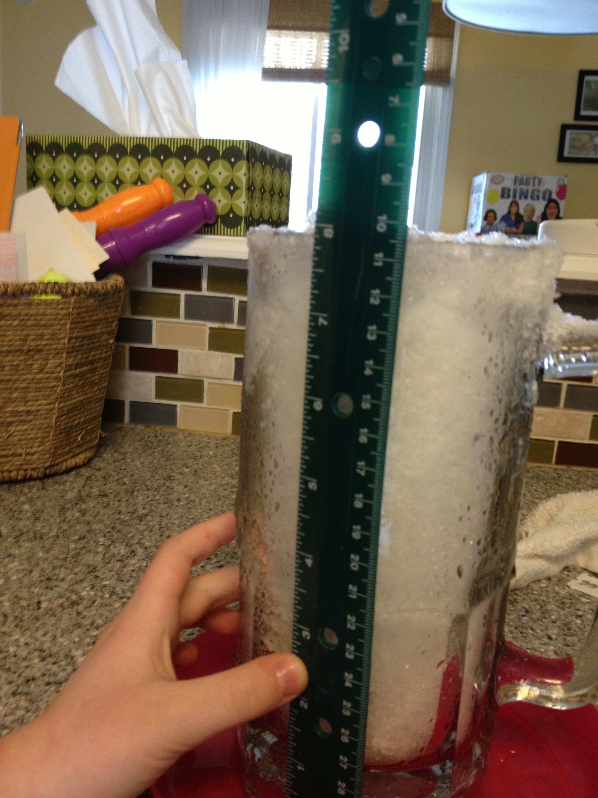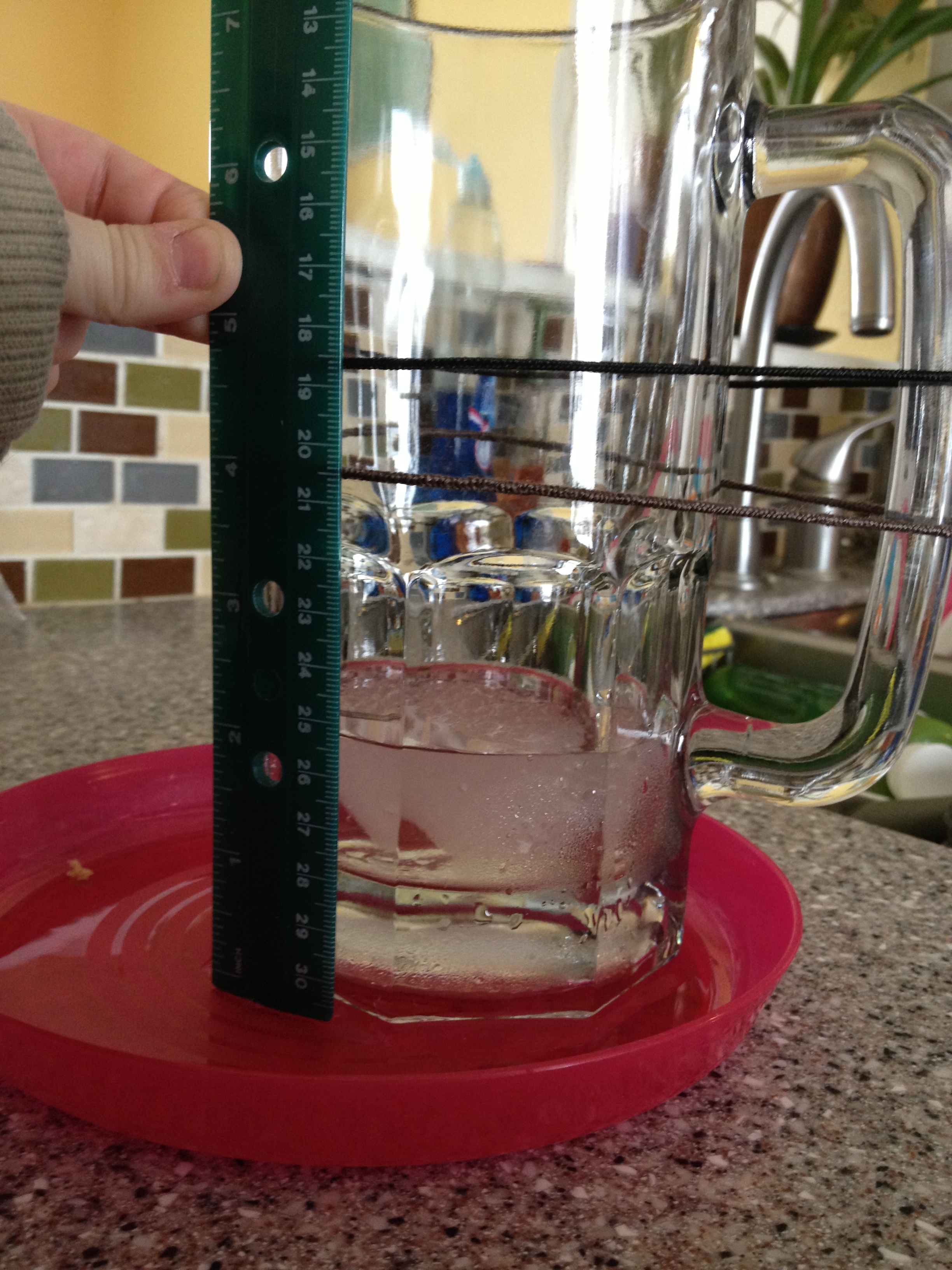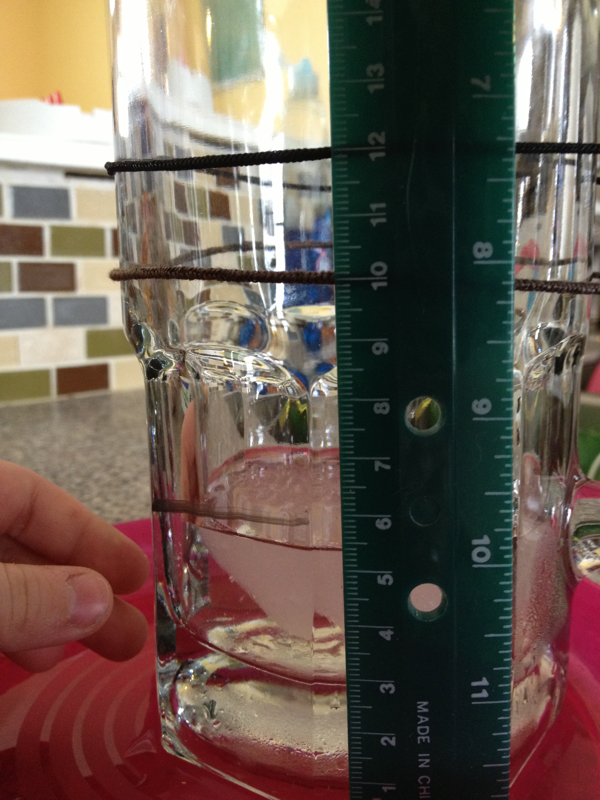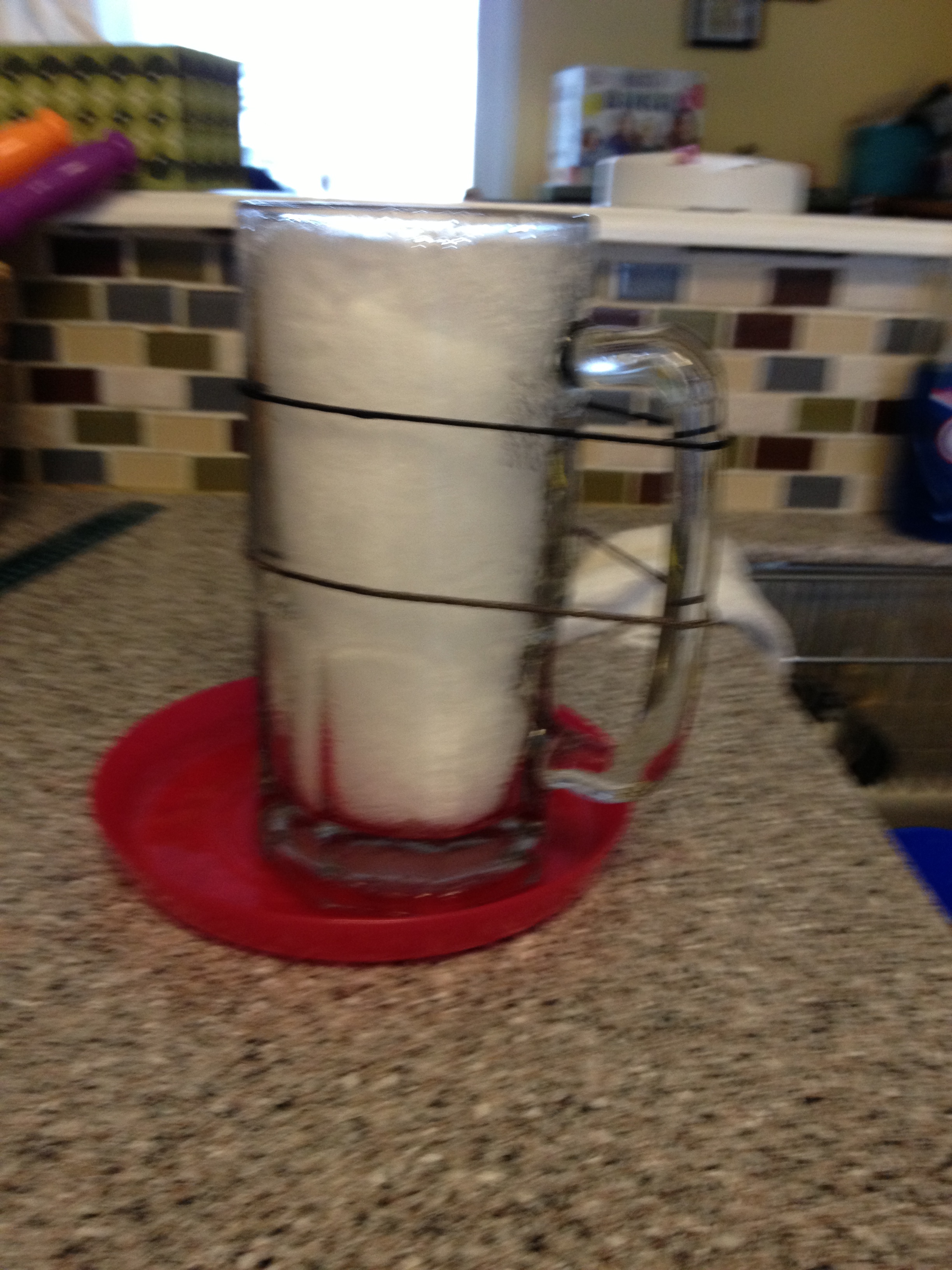 I asked her to make a prediction on how full the mug would be after it melted. We each made a prediction using her hair ties (hers on top, mine on bottom).