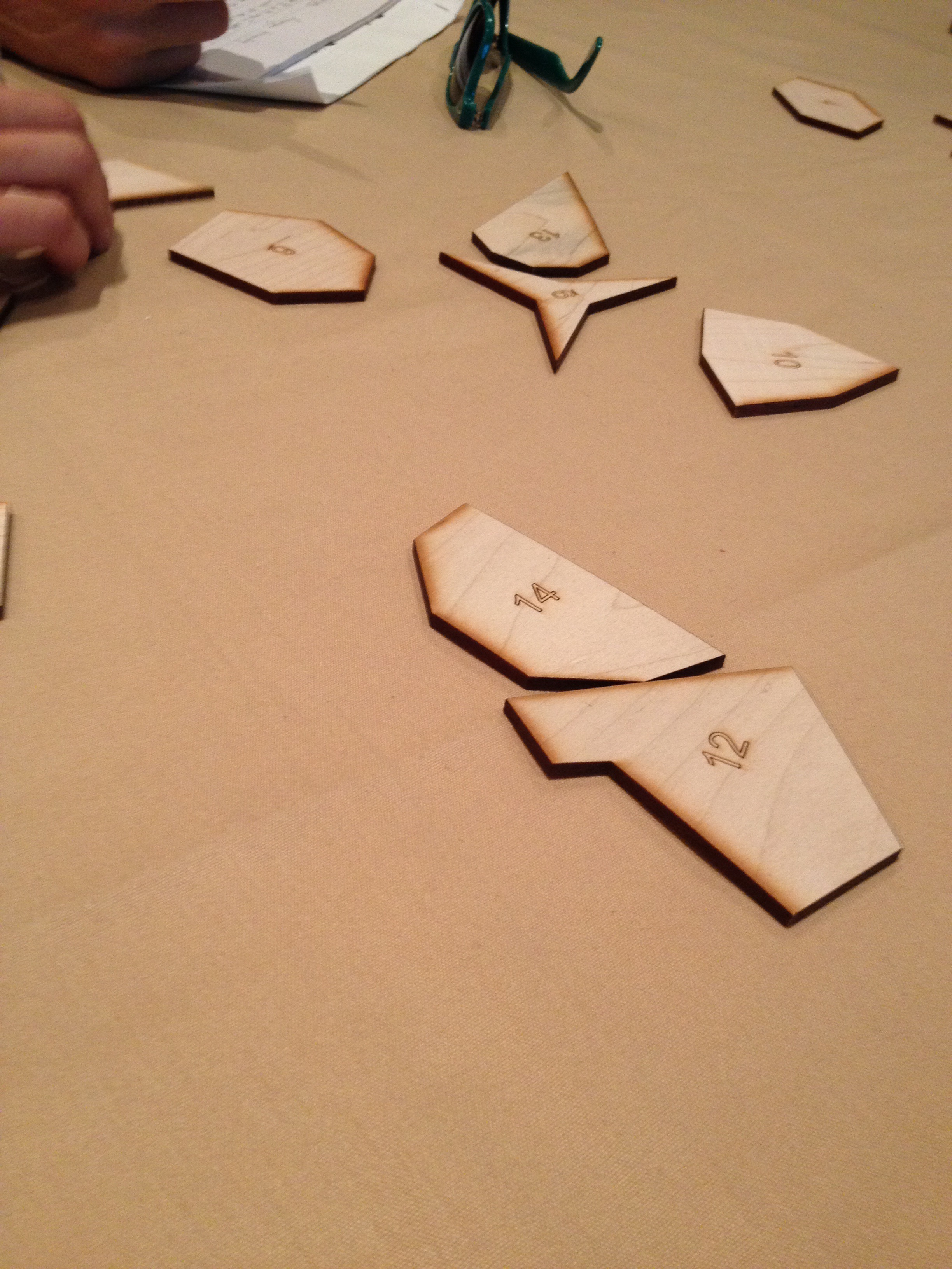 And speaking of Mathematical Play, perhaps the most fun I had in any single session was Christopher’s Hierarchy of Hexagons. Double points for an 8am start time. Christopher began by having us mentally sorting four different visual polygons into two groups (we hadn’t gotten to the hexagons just yet). Some people chose to sort the regular polygons from the irregular, others chose to sort by reflective properties. Either way, it gave us a good bit of practice until the real fun began. ENTER THE HEXAGONS.