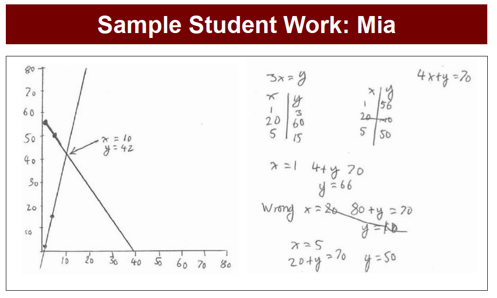 This is another go-to of mine. Either find or fabricate a sample of work and simply have students interpret. If you’re looking to pump up particular methods, consider a gallery walk of sorts featuring multiple different methods to solve a particular problem. The good folks at MARS utilize this in several of their formative assessment lessons. These are from their lesson on systems.