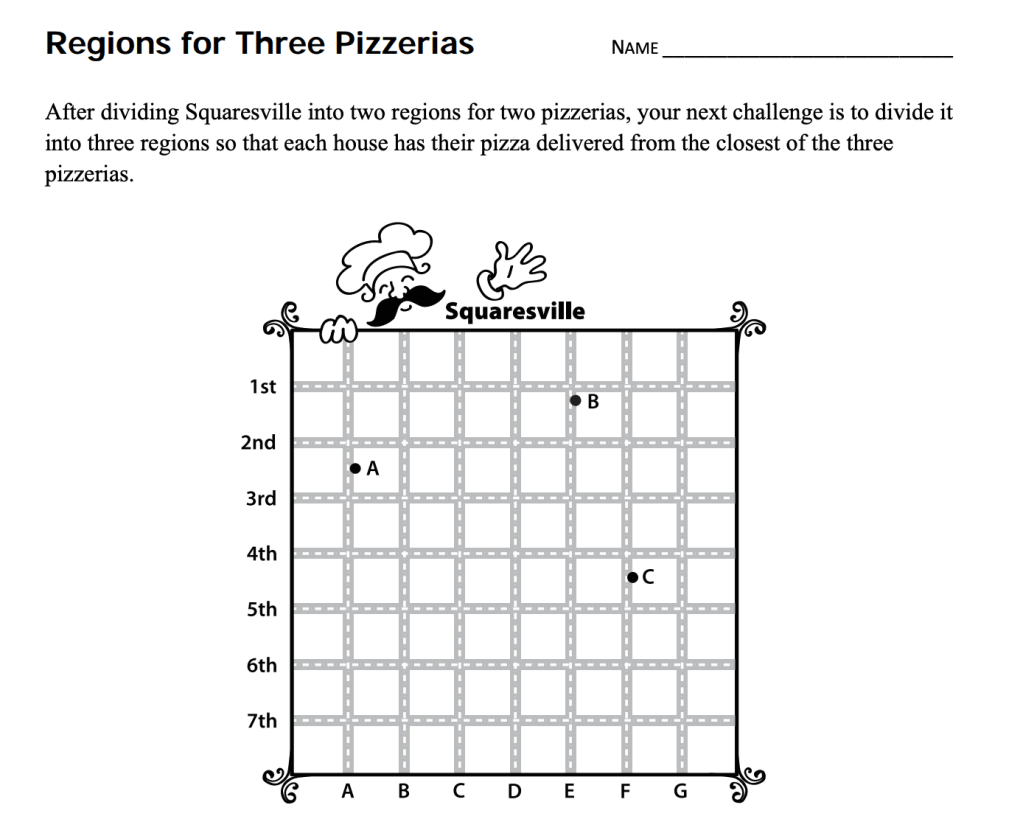 I was looking for a starting point for constructions, specifically using a compass and straight edge and constructing a perpendicular bisector. I came across a scenario I quite liked from NCTM’s Illuminations. The scenario involved identifying pizza delivery regions. (The original task is behind a paywall, but I strongly recommend you shell out the bucks for a NCTM membership if you don’t have one already.)
