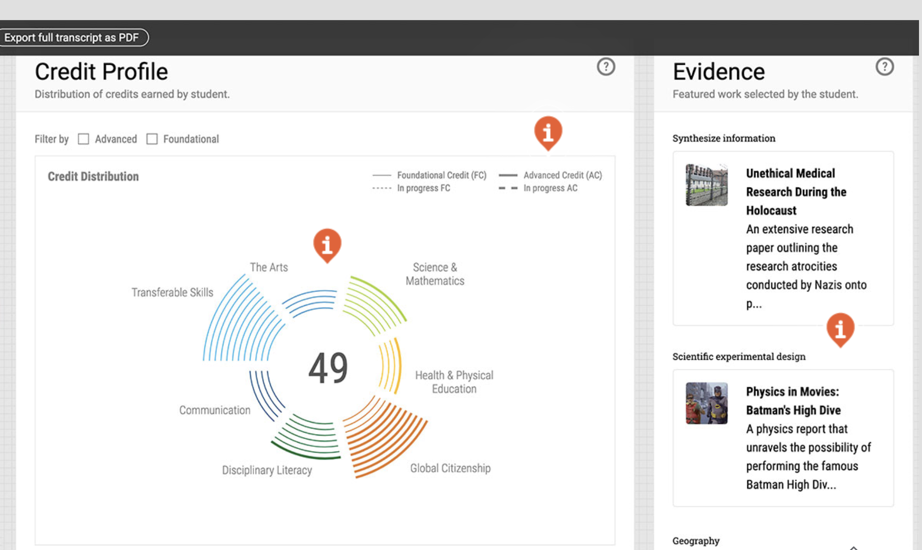 One promising structure is a digital transcript that by default, seeks evidence of student learning. My daughter is attending a school that is part of the Mastery Transcript Consortium. Their digital transcript provides a robust look at students, their skills, their coursework, and their evidence of learning via student artifacts1. It’s a promising system. This is not an advertisement for the MTC but rather an exemplar of the types of ways schools need to be thinking when they are preparing students for post-secondary institutions. The other nice thing about a digital transcript centering student work is that it is potentially an asset should students choose to apply into the workforce rather than a university.