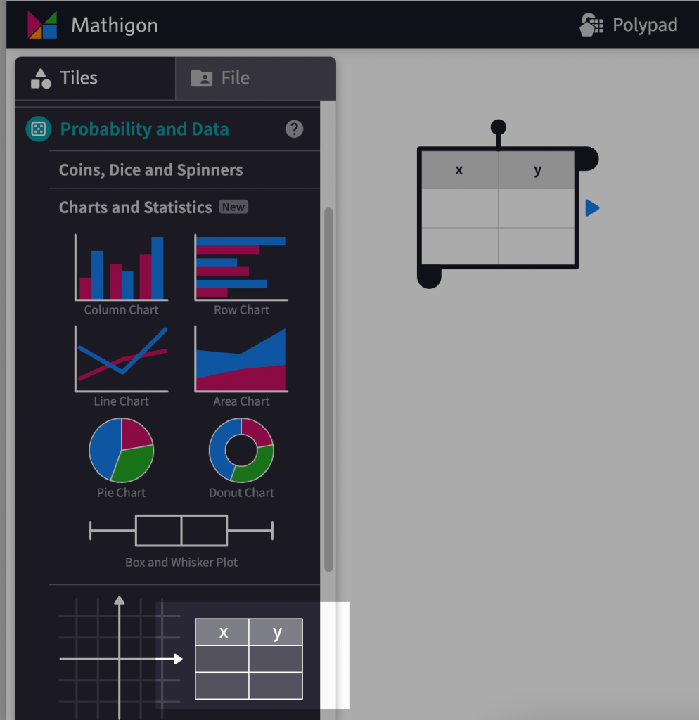 - Plop a table onto your Polypad board and fill it up with data. The table is under the “Probability and Data” tiles. You can go with your classic “x” and “y” labels, or change them depending on how you’d like the data to show up in the chart.
