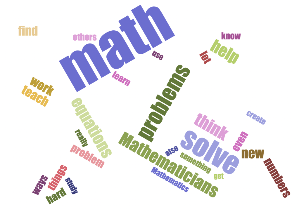 Yes, the most common response to “what do mathematicians do” is far away “math.” Maybe it’s just me, but I’d like to get a few more verbs in there. If I’m envisioning what I’d like the word cloud to say, I’d want to see words like “draw,” “conjecture,” “guess,” “create,” “play,” “build” etc.