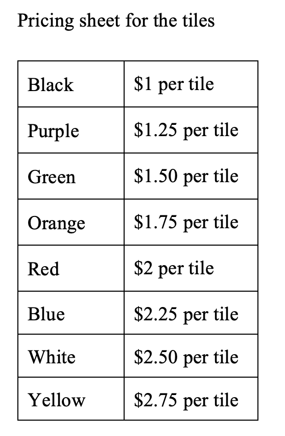 Students then calculate the “value” of their mosaic according to a pricing sheet like so.