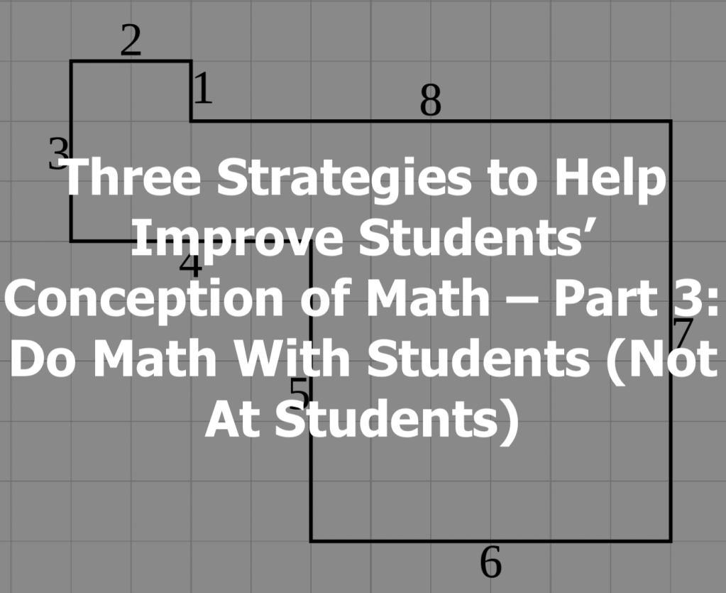 My third recommendation to help students reconcieve of math as a discipline that goes beyond calculation is to do math with students. Most teaching time is spent with the teacher doing math at students. The teacher demonstrates a procedure and the students must mimic that procedure. Math is something that happens to students, not something in which students are involved in its creation or development. The teacher is the ultimate authority and the true doer of math.
