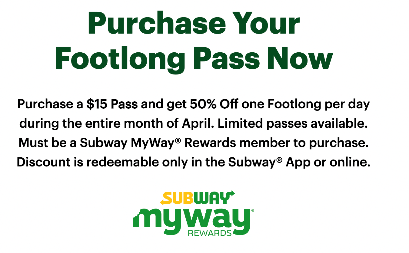 For the month of April 2023, Subway customers have the option of purchasing a “Subway Footlong Pass” for $15. You then get 50% off all (I think) Subway sandwiches for the month (digital orders only).
