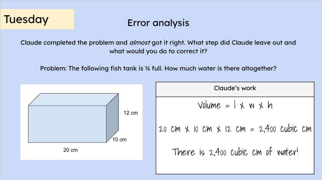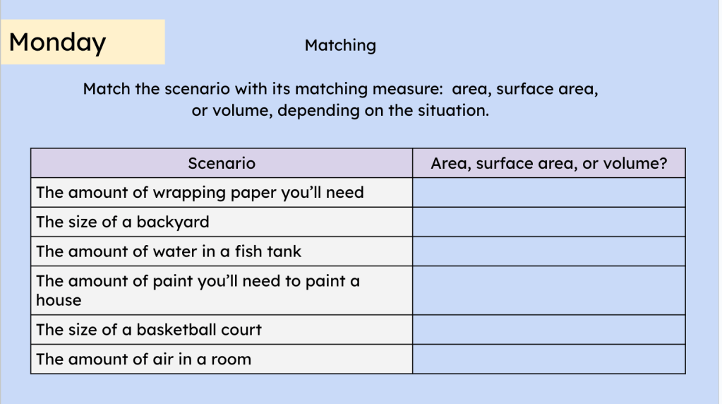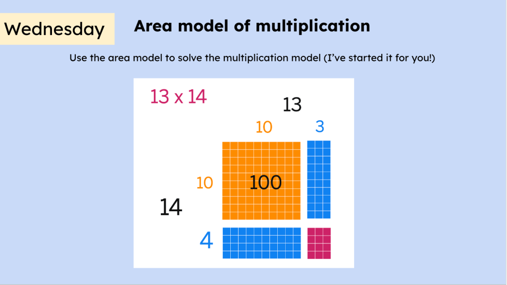 Students may not remember, say, the Area Model. Maybe their previous teachers didn’t emphasize it enough or maybe students just plum forgot. Warm Ups are an opportunity to review some of that mathematical understanding that’s in students’ heads, but might require a little excavation to find.