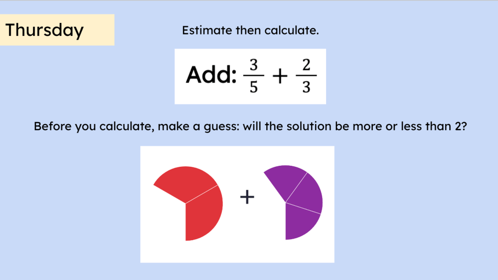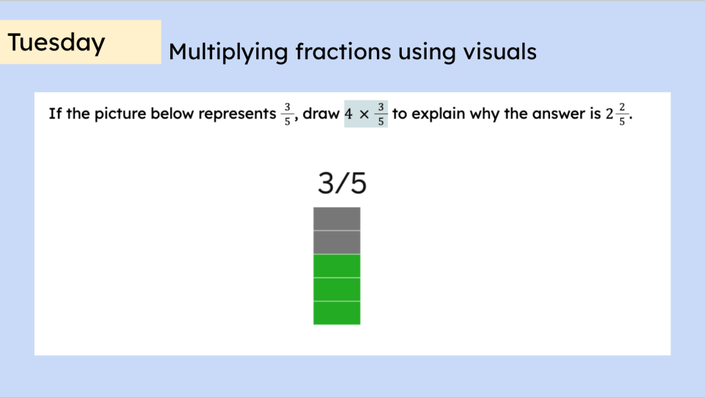 In the same way I chose Algebra warm ups as a high need area, I chose 5th grade math as a high need area. While intended for 6th grade students to experience or review 5th grade math again, there’s no reason a 5th grade teacher couldn’t use these as part of their instruction. A 7th grade teacher may identify fractions as a topic for remediation/refreshment so they might wish to implement all the fractions tasks. There are even tasks that might serve High School teachers well (I mean, what grade level couldn’t use fractions exercises?).