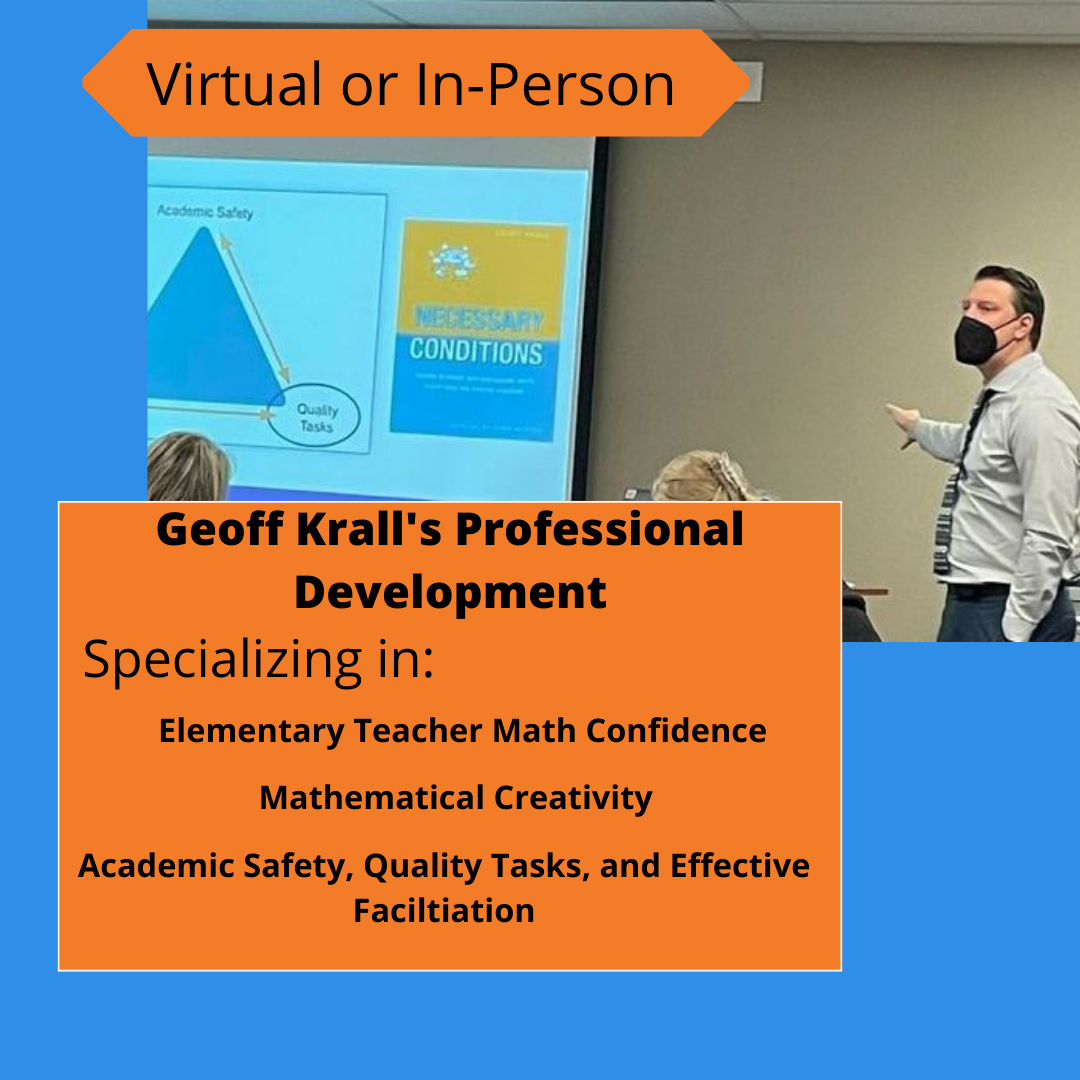 Geoff is committed to delivering high quality math professional development and coaching resulting in positive outcomes for students. Geoff currently offers three general PD formats: workshops (virtual and in-person), coaching cycles, and keynote speaking. A few areas of expertise are the following: