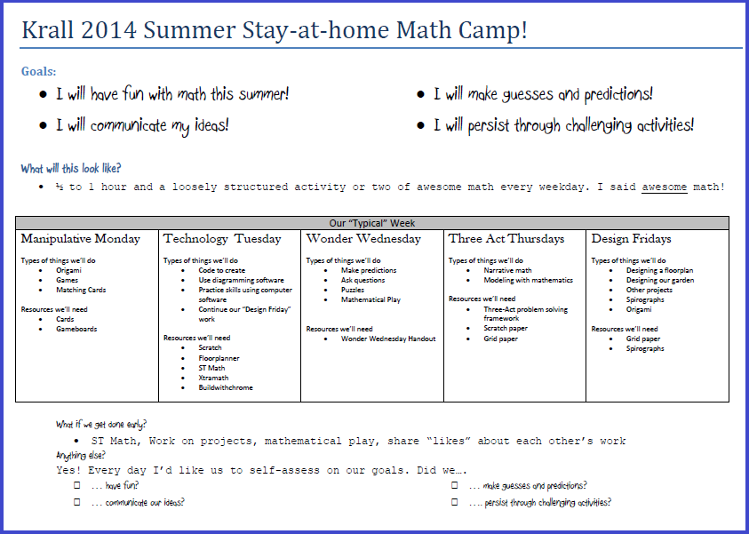 Anyway, I created a math “curriculum” for our kids this summer, based largely on the thoughtful educators who have decided to publicize their work. The curriculum is part content, part intervention, part staying-sharp.